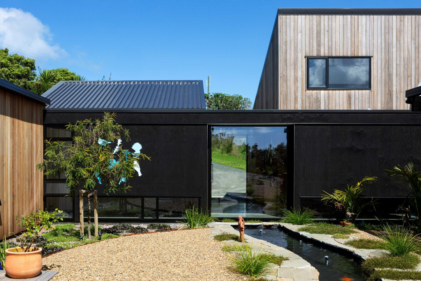 Cunningham House was designed in two stages for two different owners. The original, was a 96m² bach, two mono-pitch timber boxes linked by a flat roof. The current owners commissioned an extension: main bedroom, ensuite, dressing room, study, entry-gallery and wine cellar. The house has more than doubled to 254.80m².